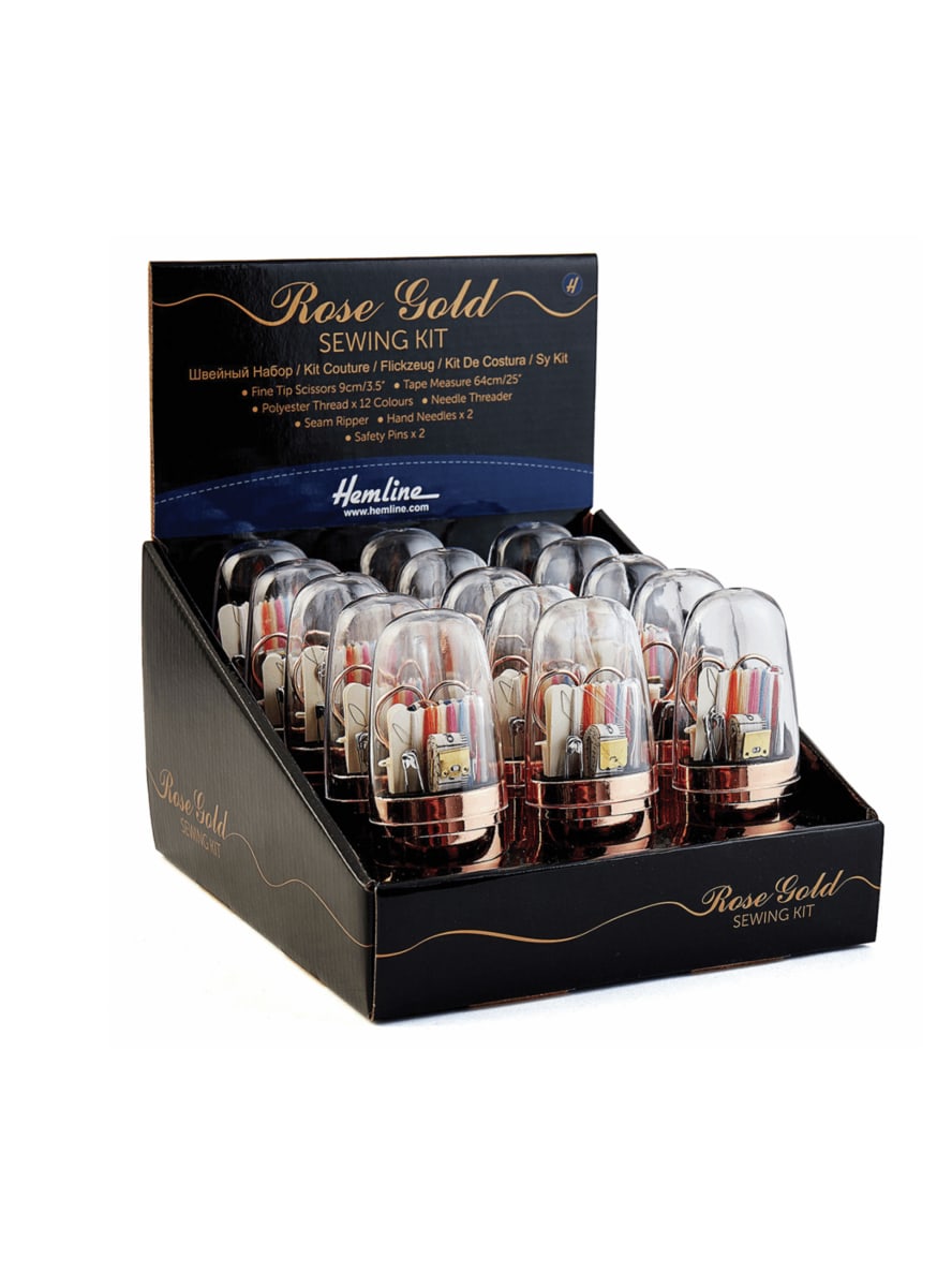 Práctico kit de costura en un estuche de acrílico cápsula Rose Gold. Ideal para viajes y uso diario.