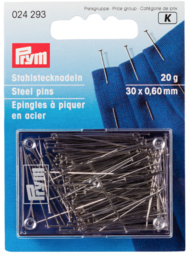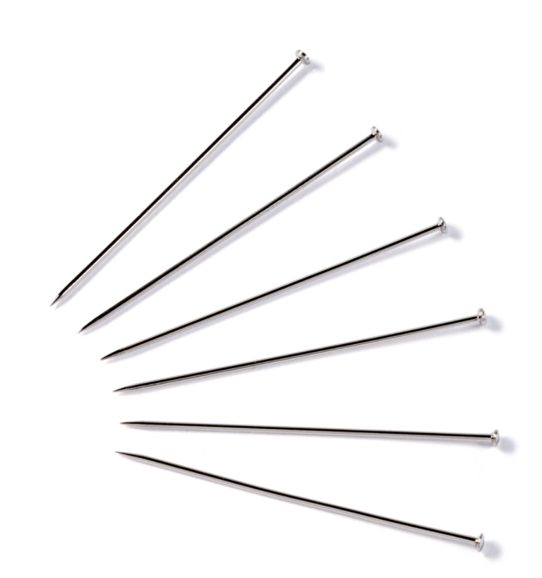 Alfileres de acero reforzado color plateado, punta extremadamente fina, caja de 15 gr, de 30mm de largo, uso universal.