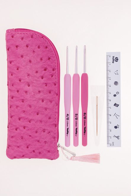 Crochets en set que contiene 3 crochet mango acolchado, Nº 2,5-3-3,5, regla, aguja de lana, viene en estuche con borla. Hecho en Japón.
