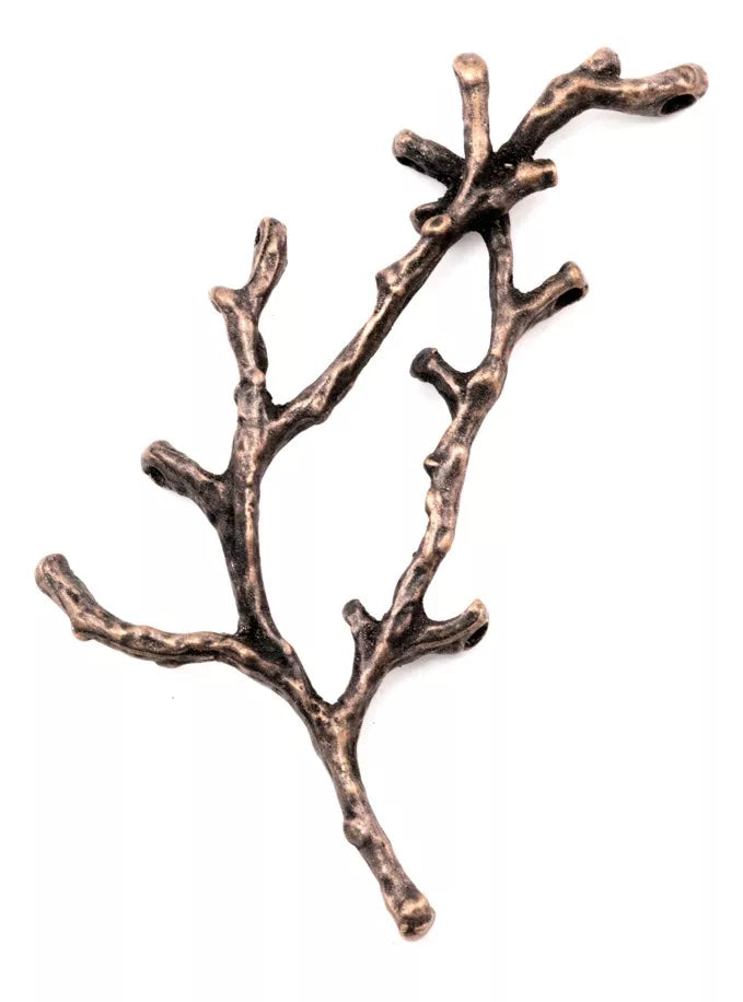 Pendiente de rama que puede ser colgado de cualquiera de la unión de sus extremidades, con un acabado de bronce que le da un aire a antigüedad.