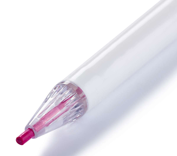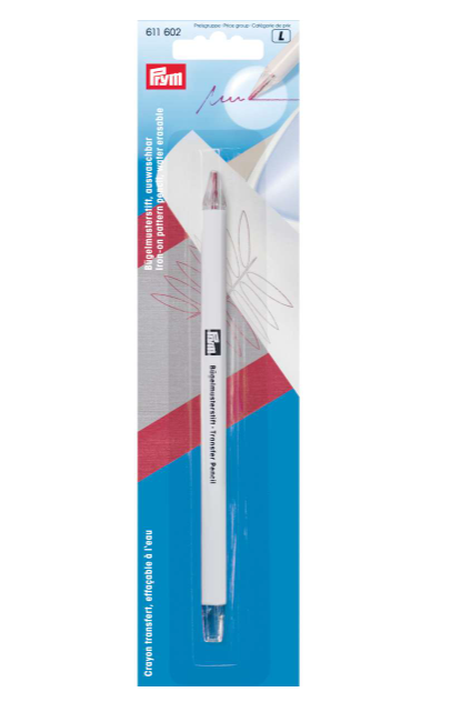Lápiz transfer para plancha sobre patterns para bordado o para transferir diseños a la tela. Tinta roja, con punta retráctil. Se lava y desaparece. Es una tinta especial para marcar diseños sobre telas naturales como algodón o lino. Se marca el diseño sobre un papel transparente. Para asegurar que el diseño se transfiera de forma correcta, se sugiere marcarlo también por el revés del papel. Luego se plancha el papel sobre la tela con temperatura media. Una vez terminado el bordado o el trabajo a realizar, las marcas lavan con facilidad. No apto para telas sintéticas o mezclas. Tampoco es apto para seda.