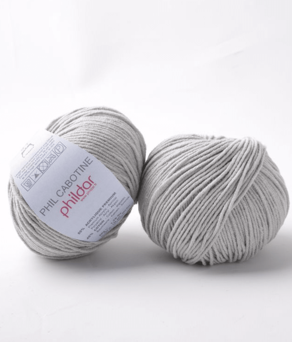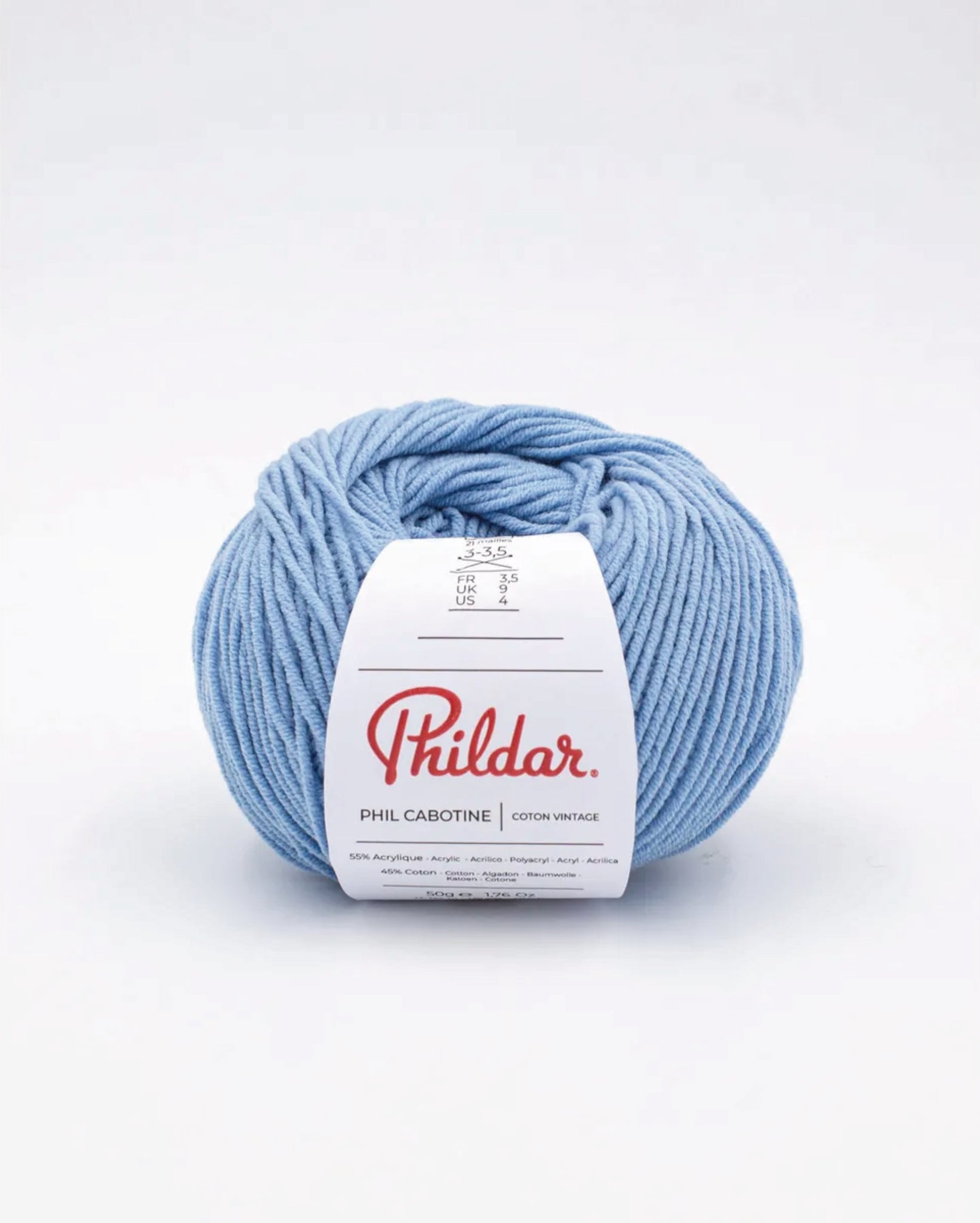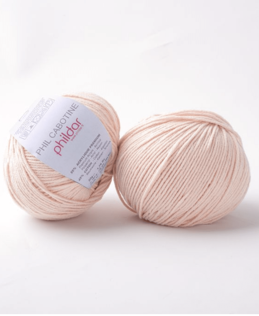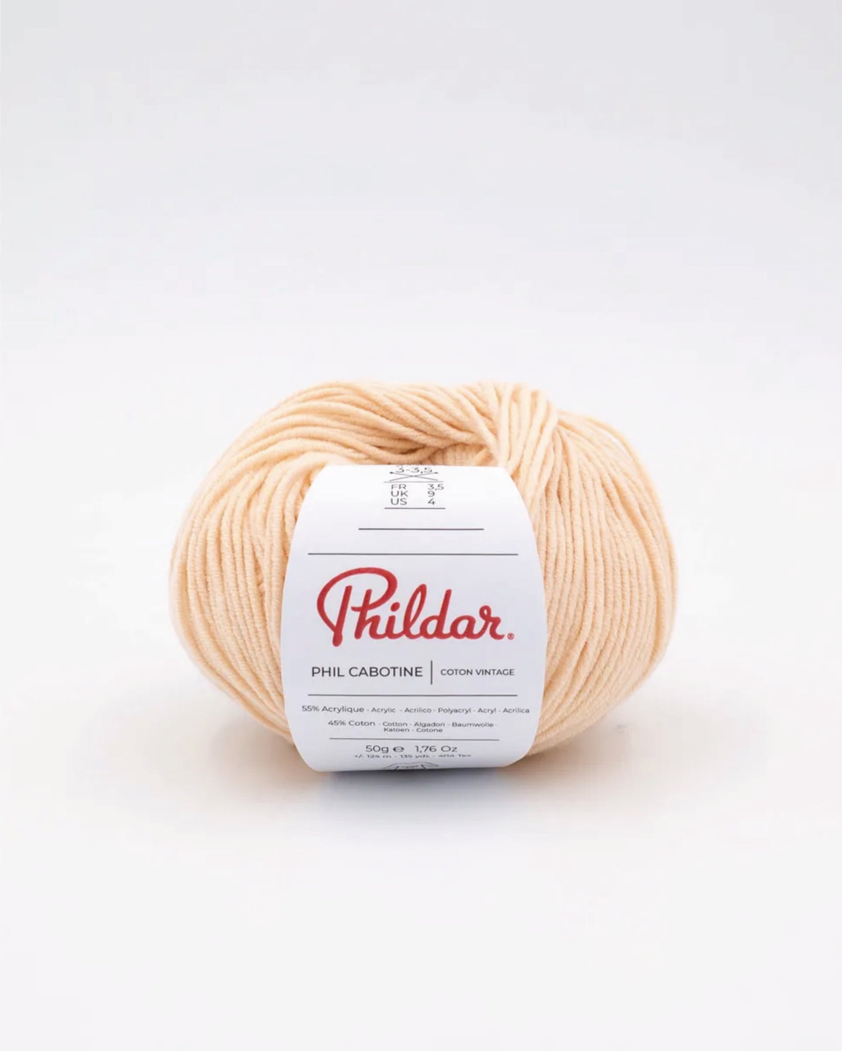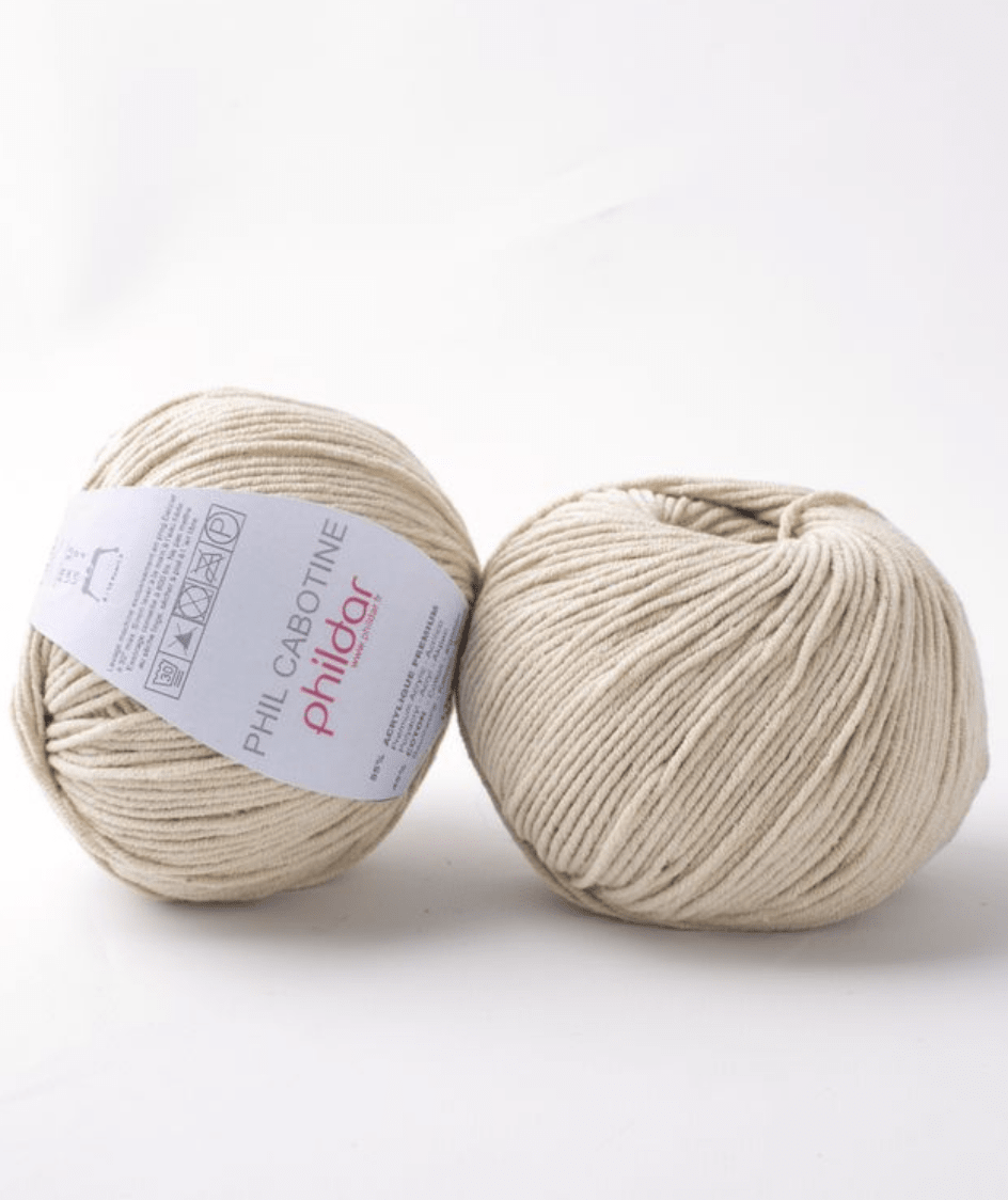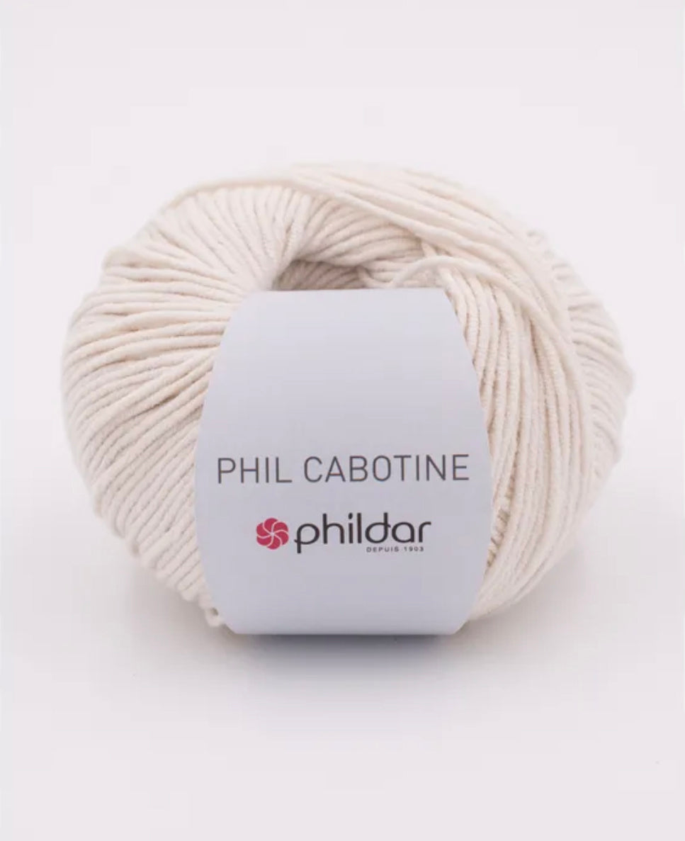 Phil Cabotine, es un hilado de fibra suave y ligeramente blanqueada lo que le da una sensación un poco vintage. Es una combinación de algodón y acrílico de alta calidad, lo que la hace una super opción para el verano y de mantención más fácil. Este algodón es una opción buena para principiantes.