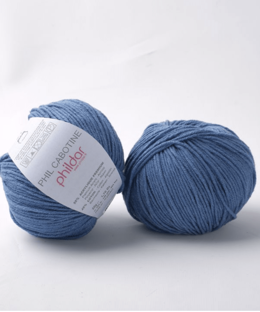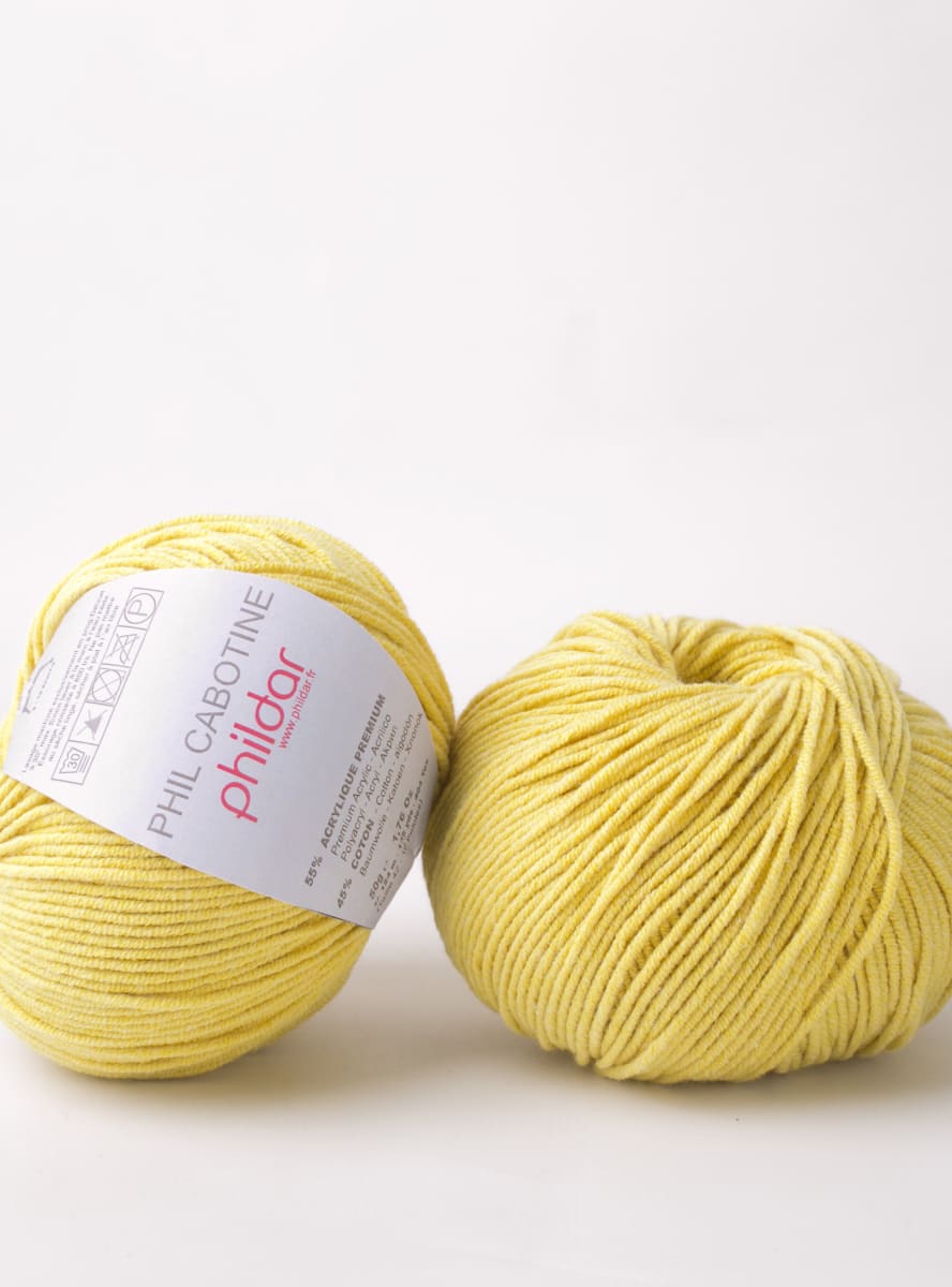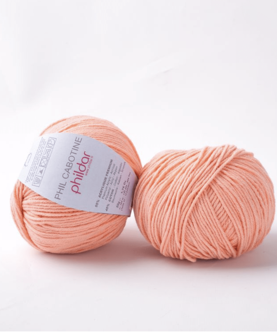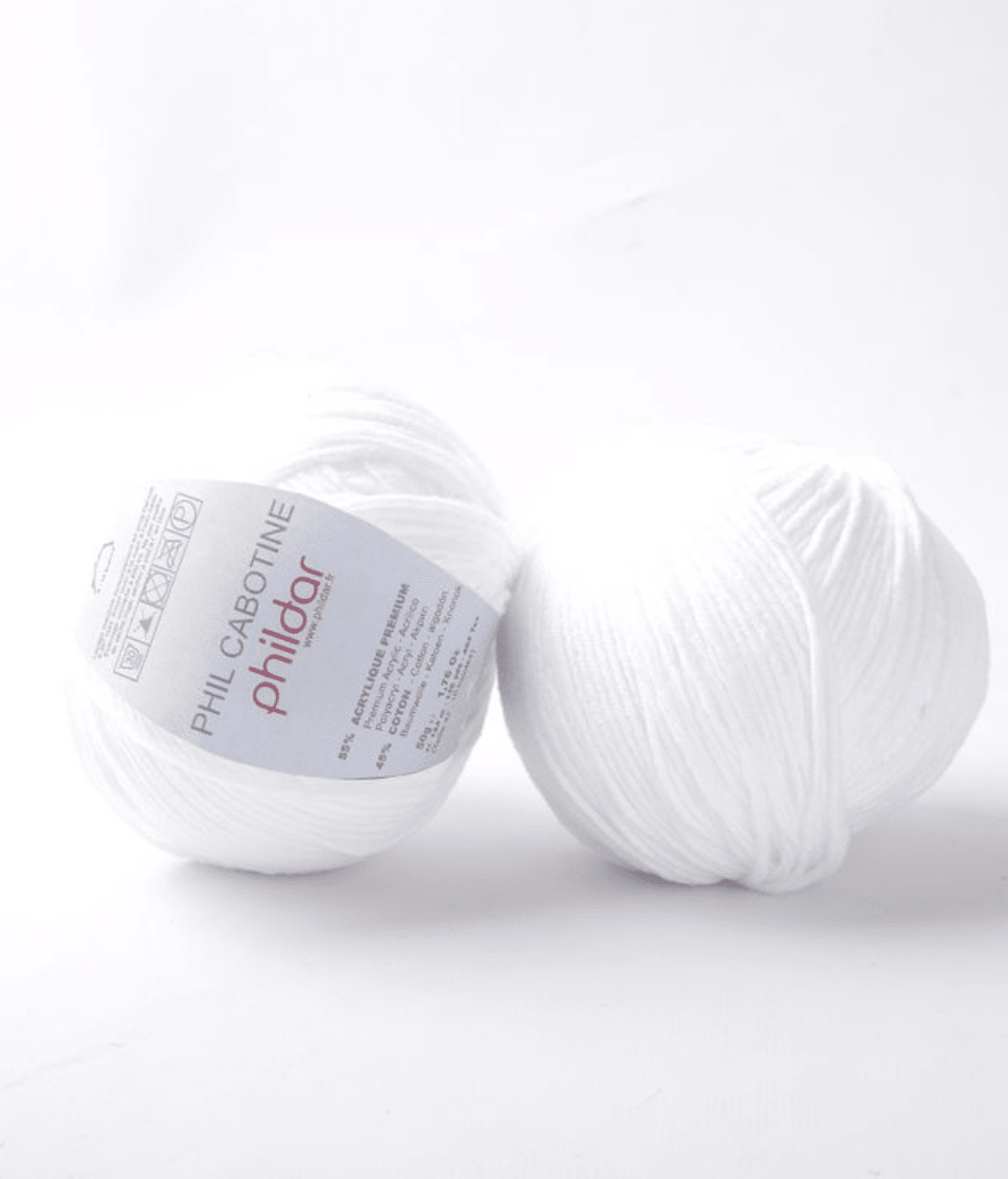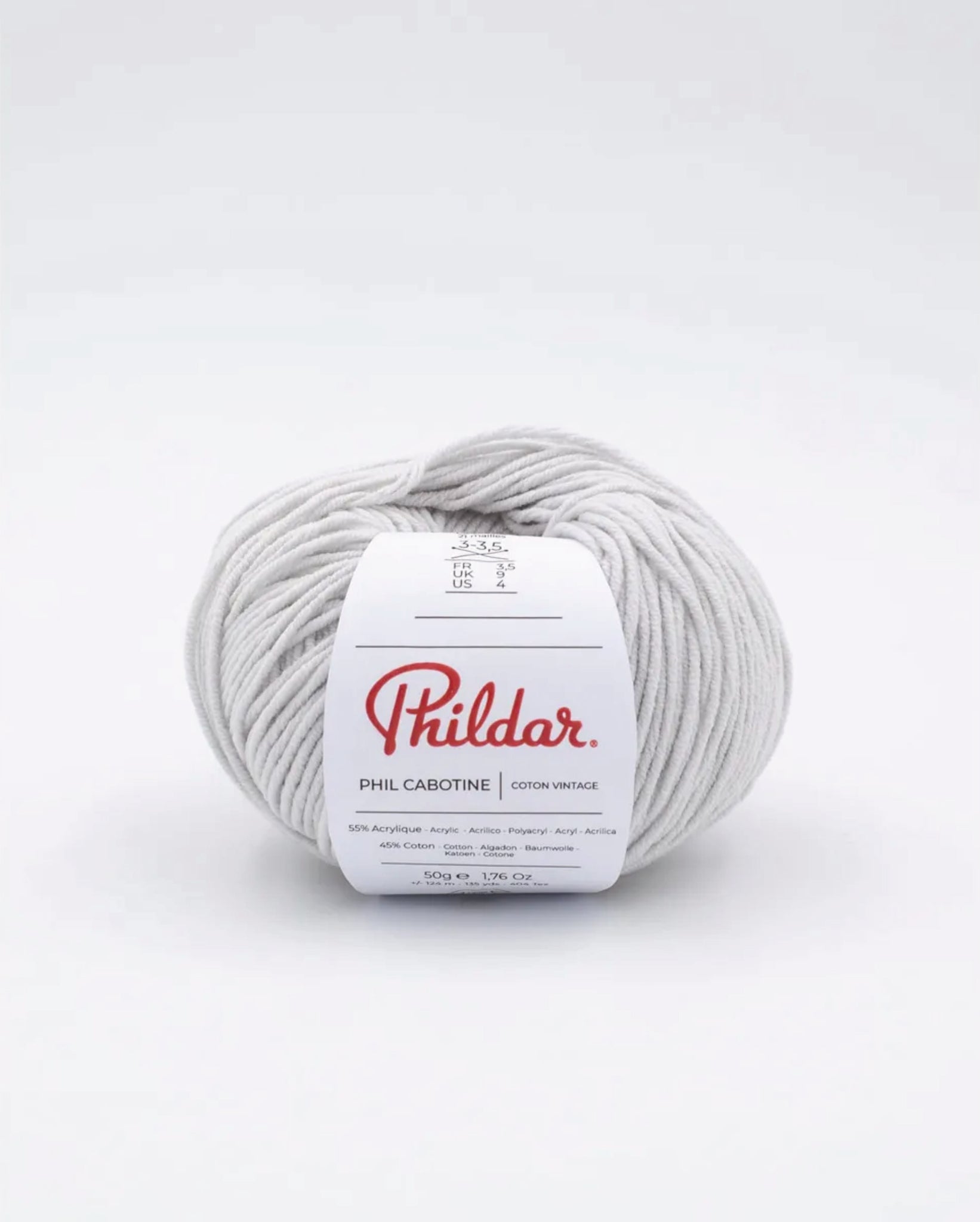 Phil Cabotine, es un hilado de fibra suave y ligeramente blanqueada lo que le da una sensación un poco vintage. Es una combinación de algodón y acrílico de alta calidad, lo que la hace una super opción para el verano y de mantención más fácil. Este algodón es una opción buena para principiantes.