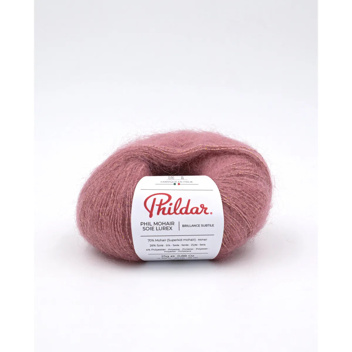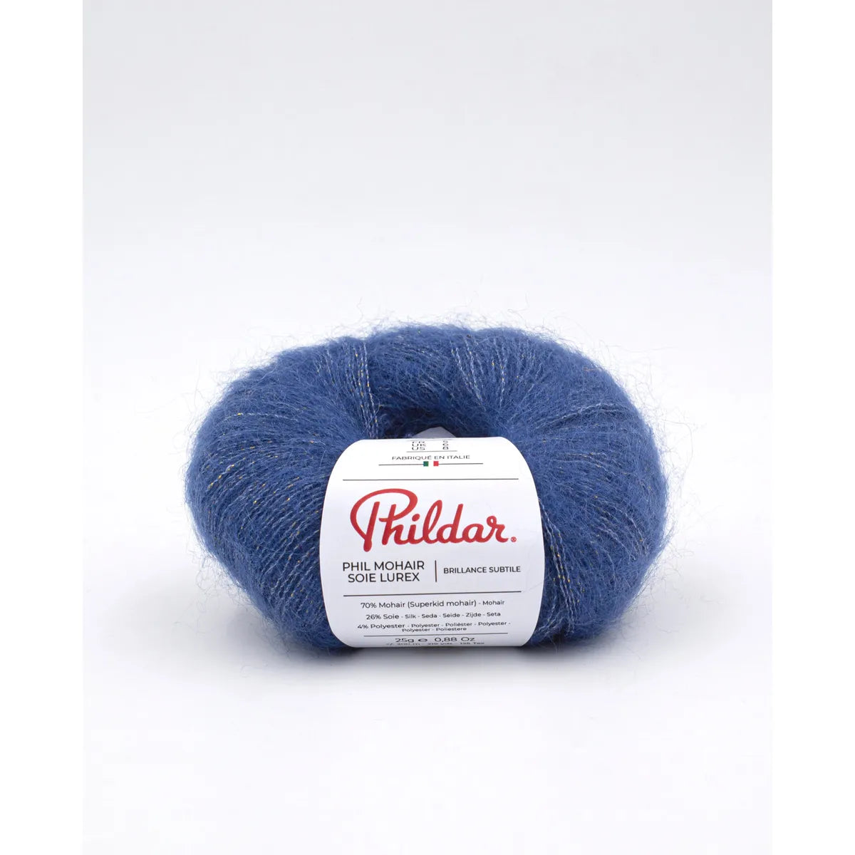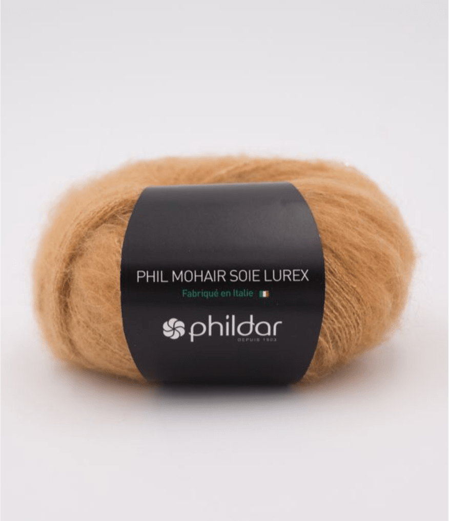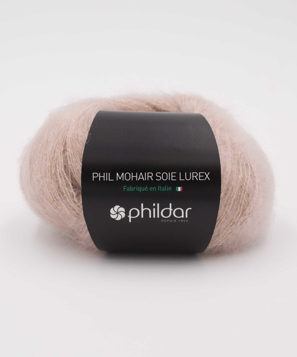 Phil Mohair Soie Lúrex es un hilado noble, y muy trendy. Fabricado en Italia, su calidad es notable y su brillo sutil le da una finura muy especial a las prendas, y las hace adecuadas para la noche. Es muy ligera y calientita. Su combinación con la seda la hace firme y resistente. Un lujo tanto para tejerla como para usarla. Es bastante rendidora.