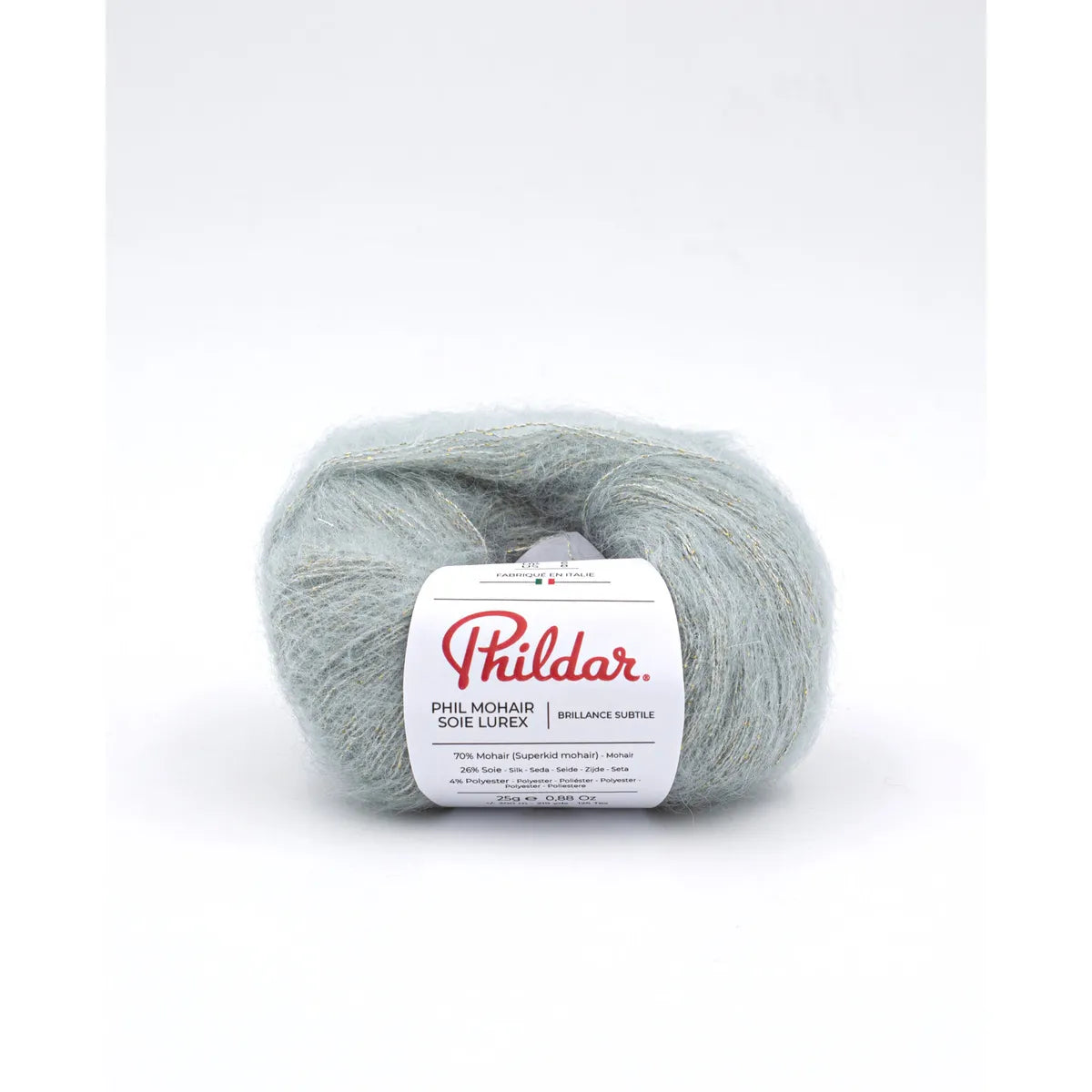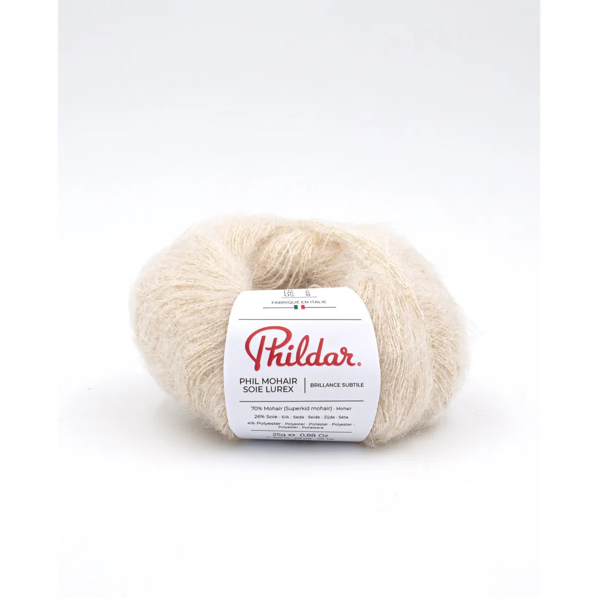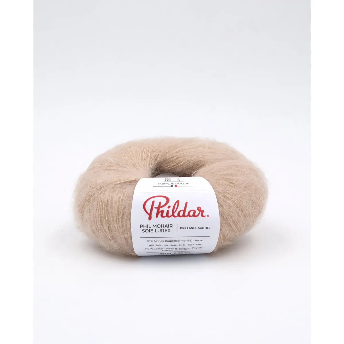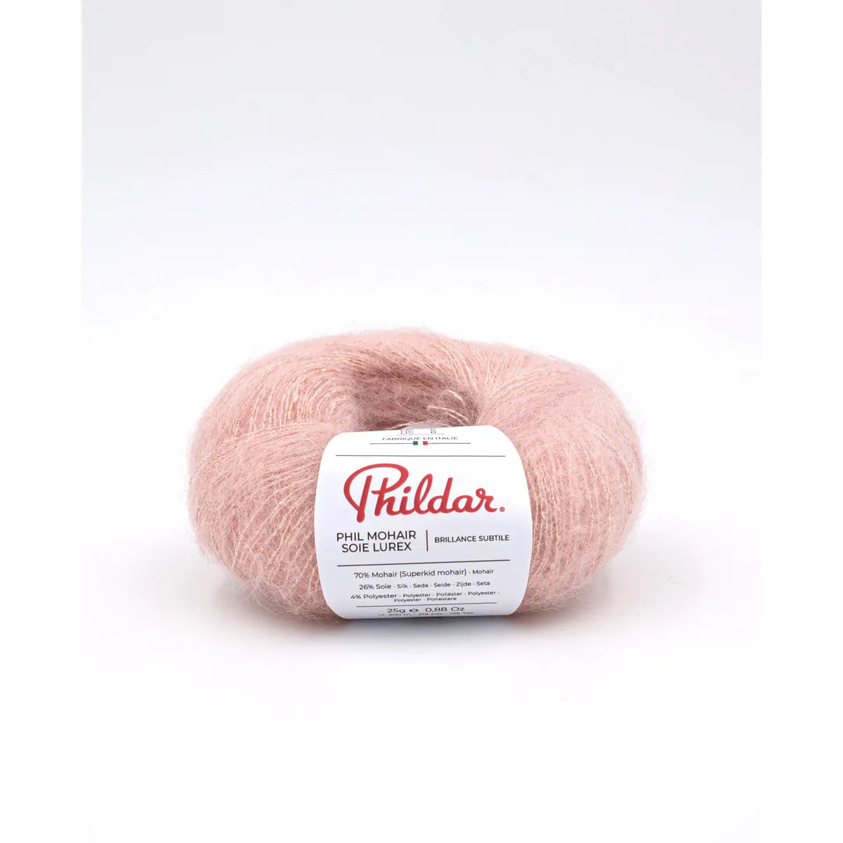 Phil Mohair Soie Lúrex es un hilado noble, y muy trendy. Fabricado en Italia, su calidad es notable y su brillo sutil le da una finura muy especial a las prendas, y las hace adecuadas para la noche. Es muy ligera y calientita. Su combinación con la seda la hace firme y resistente. Un lujo tanto para tejerla como para usarla. Es bastante rendidora.